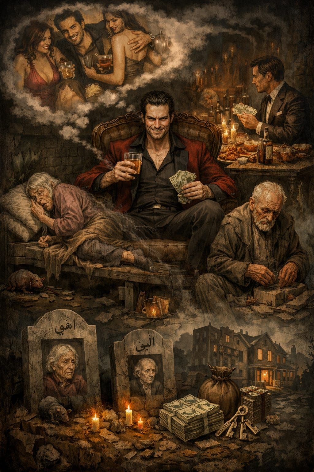 في بيت والديه، حيث يفترض أن يسكن الاحترام والحنان، كان المشهد مختلفاً. استغلّ والديه وإخوته بلا رحمة، محوّلاً المنزل إلى مساحة لخدمة نزواته. كان يدعو النساء بلا حرج، كما يقيم الولائم للتجّار وأصحاب المال، لا من كرمٍ أصيل، بل من رغبة في التباهي وبناء علاقات قائمة على المصلحة المحاولة الحثيثة لنصب الآخرين. كانت تلك الولائم تُقام على حساب تعب والديه المسنّين، اللذين أنهكهما العطاء القسري، بينما هو ينفق بسخاء على الغرباء، كأنّ المال ليس إلا وسيلة لإشباع غرورٍ لا حدّ له.
